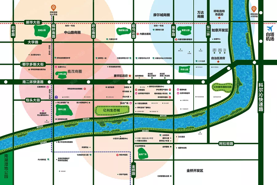 相比于前面三个楼盘,亿利生态城的优势还是比较明显的,首先就是属于赛罕区,位置靠市区更近,虽然出了南二环,但金桥这边是呼市最早发展的开发区,目前基础配套的商场、学校、公共交通已经完善,这几年小黑河治理的也很好,自然环境优越。