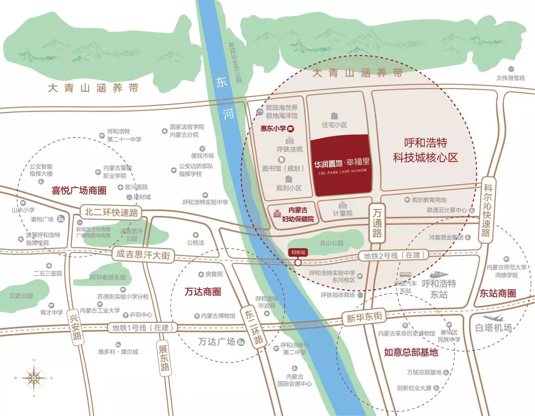 介绍项目的时候,小A首先对于华润幸福里楼盘的位置还是比较困惑。这个也难怪,因为华润所在的位置算是呼市的最北端,靠近大青山和110国道,现在周边的路也没完全修通,就连配套之一、算是地标建筑的新内蒙妇幼也有许多人尚不知情,周边的几个楼盘也都是近年新建的,所以这个区位描述属实有点困难,也不够精准。