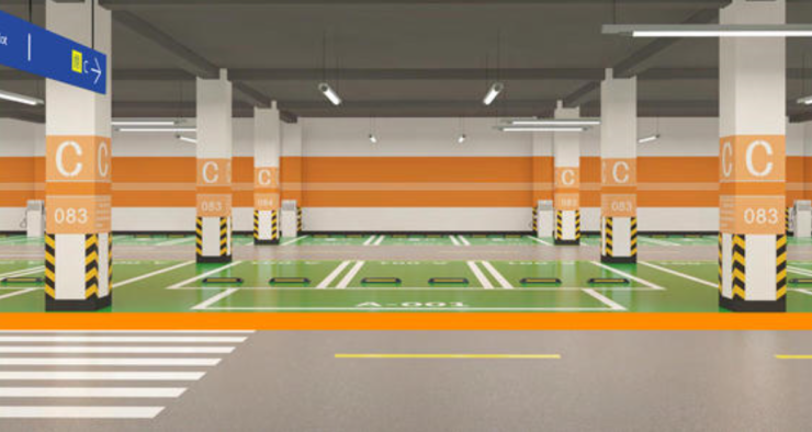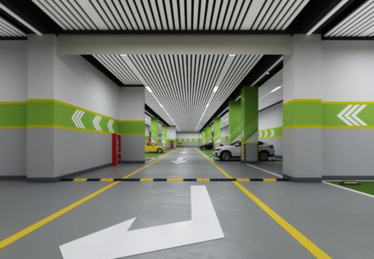 专属分区色彩,地下车位地面、柱面、墙面依据不同区域使用不同颜色划分。