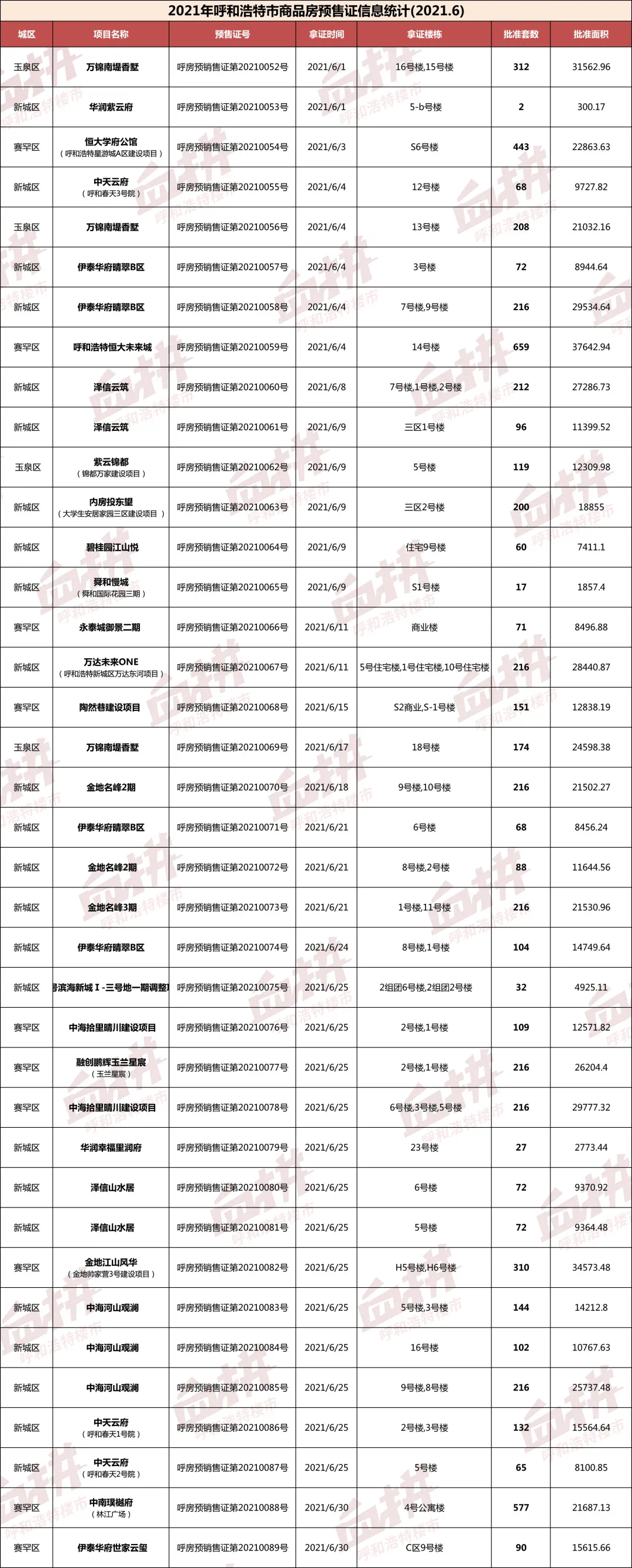 2021年上半年宣告结束,刚刚过去的6月,呼和浩特共颁发38张预售证,6368套房源获准上市,其中新城区预售证最多,有24张,赛罕区次之10张,玉泉区4张,回民区挂0。