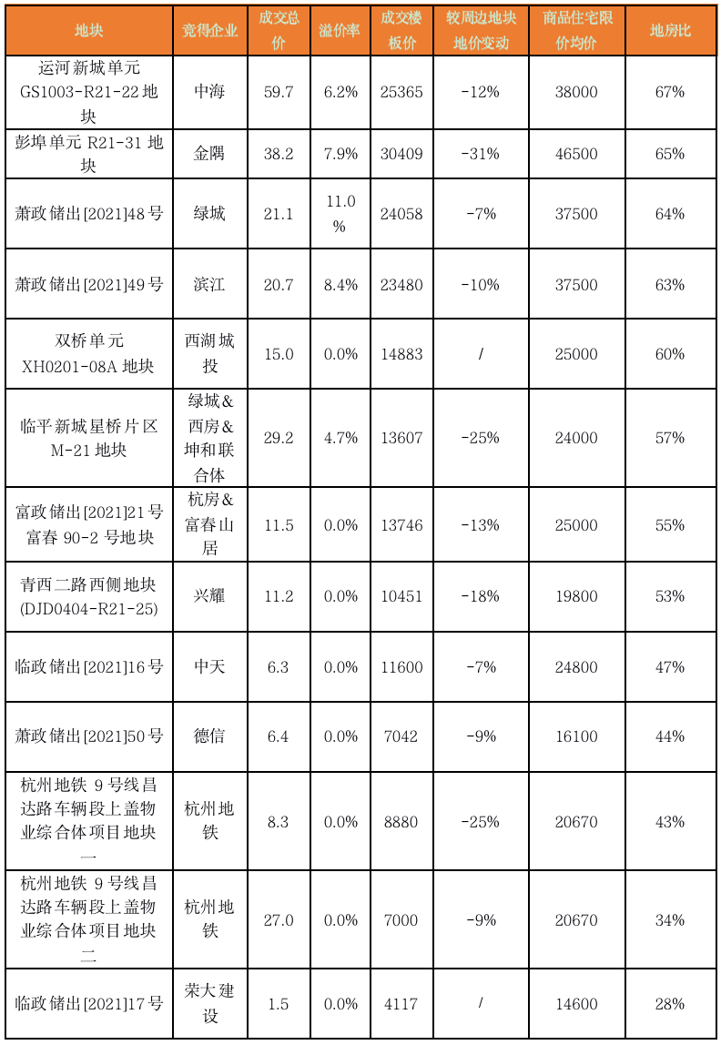 从溢价成交的核心地块来看,按照名义楼板价和商品住宅限价测算,地房比多在60%以上,如果考虑配建,地房比会更高,盈利空间将进一步被压缩。以溢价率较高的地块萧政储出[2021]48号市北东地块为例,名义楼面价24058元/平方米,该地商品住宅限价37500元/平方米,名义地房比为64%,剔除10%的配建公租房外,地房比为71%,盈利空间薄弱。