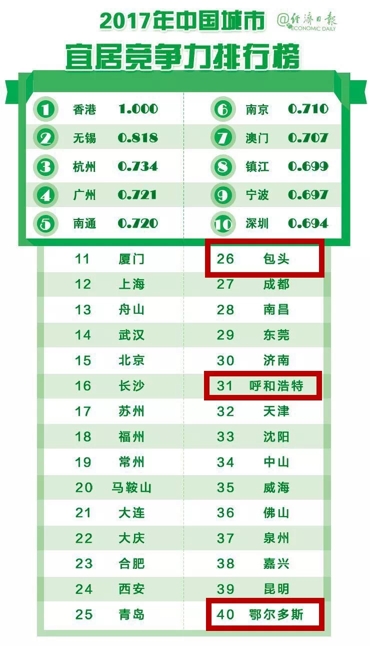 在宜居竞争力排行榜中,内蒙古有3个城市位居前40强,分别是:包头(第26位)、呼和浩特(第31位)、鄂尔多斯(第40位)