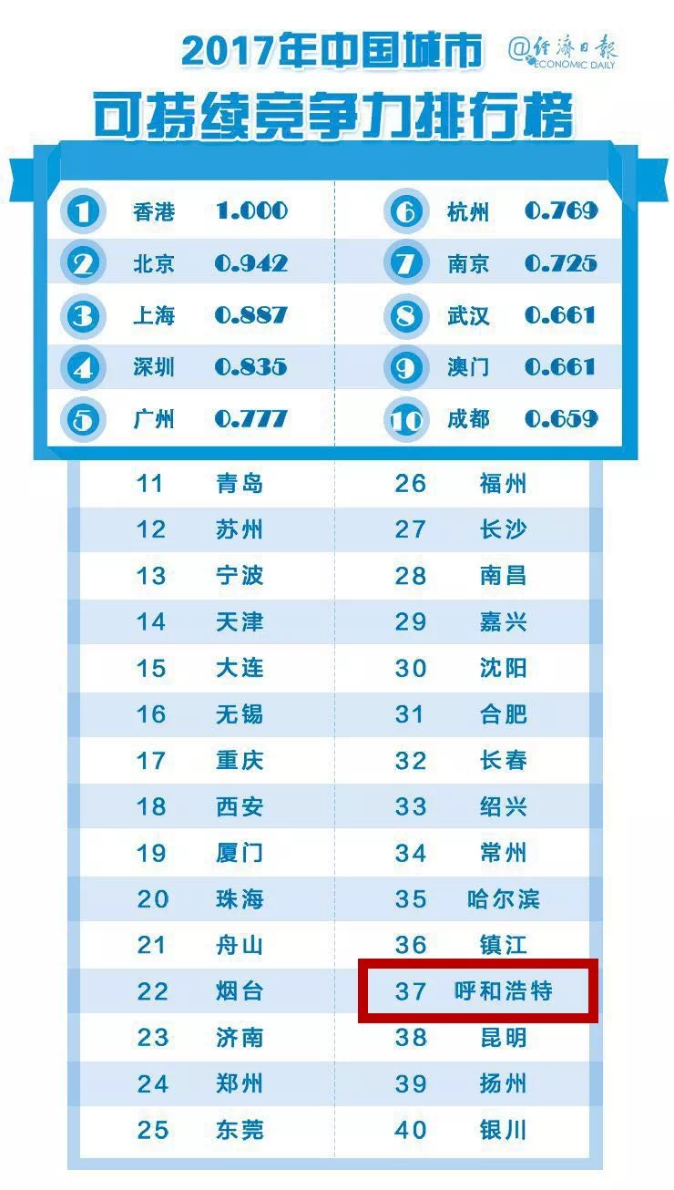 在可持续竞争力排行榜中,内蒙古自治区首府呼和浩特市进入前40强(第37位)。
