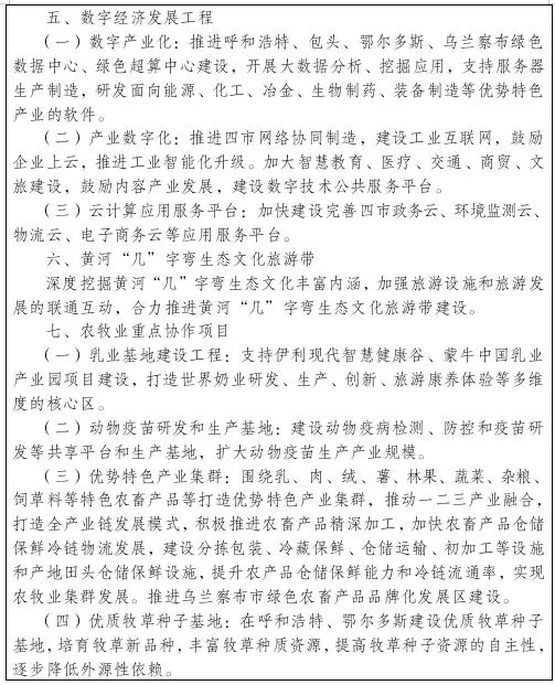 第五章协同建设现代化产业体系发挥四市各自比较优势,创新区域间产业合理分布和上下游联动机制,加强产业对接协作,优化、稳定、提升产业链供应链,推动具备条件的产业集群化发展,加快构建高效分工、错位发展、有序竞争、相互融合、绿色低碳的现代产业体系。排名前列节引导优势特色产业合理布局坚持市场机制主导和产业政策引导相结合,对接四市产业规划,完善区域产业政策,优化优势特色产业布局和统筹发展。以呼和浩特市为龙头发展现代服务型经济,以包头市稀土新材料为重点建设战略资源基地,以鄂尔多斯市为重点建设现代能源产业基地,以乌兰察布市为支点打造物流枢纽和口岸腹地,推动形成特色鲜明、分工合理、相对完整、安全可靠的区域产业链供应链体系。呼和浩特市。重点发展乳业、光伏材料、生物医药、节能环保等产业,突出发展金融、商务、物流、会展、信息、旅游等现代服务业,培育壮大动漫、影视、创意等文化产业,培育发展品牌肉粮等食品加工业,做强做优做大乳制品产业。包头市。重点发展稀土新材料等新型材料、现代装备制造、绿色农畜产品精深加工等产业,大力发展风光氢等现代能源,着力加强稀土资源综合开发利用,延伸发展稀土、钢铁、铝、硅材料等产业链条,培育发展核电燃料制造业,打造军民融合特色产业集群。鄂尔多斯市。重点推进煤炭分级分质利用,加快发展新能源产业,构建多能互补的现代能源产业体系,推动现代煤化工产业向精细深加工、高端化发展,向煤基精细化学品、煤基新材料及终端应用方向延伸,培育发展临空经济,建设绿氢生产基地,打造高级羊绒产业基地。乌兰察布市。重点发展风光储能、储氢等清洁能源产业,大力发展旅游、康养产业,培育壮大石墨新材料产业集群,扩大马铃薯、燕麦等优质绿色农畜产品供给,推动数据中心延伸发展,稳步发展高端建材、风电光伏设备制造等产业,建设2022年北京冬奥会辐射延伸产业基地。第二节推动重点产业联动融合发展协同发展现代能源经济。根据资源环境承载能力,优化能源开发布局,合理控制煤炭开发强度,有序有效开发鄂尔多斯盆地综合能源基地资源,加快淘汰落后煤电机组,构建以新能源为主的新型电力产业。以煤化电热一体化为重点,推进煤炭清洁高效利用,推动能源化工产业链向精深加工、高端化发展,稳妥推进绿色煤化工示范工程。坚持集中式和分布式并举,大力提升风电、光伏发电规模和质量,建设包头、鄂尔多斯、乌兰察布千万千瓦级新能源基地,打造黄河“几”字弯清洁能源基地,积极创建国家现代能源经济示范区。统筹发展先进新材料产业。以呼和浩特市为重点建设光伏材料产业基地,以包头市为重点建设稀土新材料产业基地,以鄂尔多斯市为重点建设煤基等新材料产业基地,以乌兰察布市为重点建设石墨新材料产业基地,按照集群化发展方向,强化区域优势产业协作,增强要素保障能力,优化改造提升产业链供应链水平,打造先进新材料产业集群。合力打造数字经济高地。建设呼和浩特、乌兰察布、鄂尔多斯等大数据清洗加工基地,围绕大数据核心业态,发展海量数据存储设备、高性能计算机、网络设备、数据采集产品以及大数据一体机等大数据硬件产品制造,打造呼包鄂乌数字经济产业集群区,引领自治区建设高级数字经济创新发展试验区。制定呼包鄂乌工业互联网协同发展行动方案,有序推进自治区工业互联网二级标识解析节点建设,统筹布局工业互联网平台,推广企业上云和工业APP应用。提高工业互联网、人工智能、大数据对传统产业渗透率,推动优势制造业绿色化转型、智能化升级和数字化赋能。联合打造高端特色旅游目的地。树立全域旅游观念,以发展文化遗产、草原风情、健康体育和休闲度假为重点,以交通和旅游线路合作为突破,以建设鄂尔多斯国家文化和旅游消费示范城市、呼和浩特国家文化和旅游消费试点城市为契机,深化旅游合作,整合旅游资源,加强生态区、文化区和产业区的旅游服务功能融合,跨城市培育旅游“黄金线”,串联打造黄河“几”字弯生态文化旅游带。加强呼包鄂乌文化旅游的交流与合作,推动四市文旅活动的共谋共建共享,推进旅游要素流动无障碍化、旅游市场一体化,打造呼包鄂乌智慧旅游区域品牌。整合区域内红色旅游资源,开发互联互通的红色旅游线路,创建大青山全国红色旅游融合发展示范区。依托高铁网络和站点,推出“高铁+景区门票”“高铁+酒店”等快捷旅游线路和产品。整合建立呼包鄂乌旅游信息平台,实现旅游政务信息、旅游资源和咨询共享互换,推进四市旅游“一机畅游”。组织开展呼包鄂乌文化和旅游联合执法检查,协同打击查处违法违规行为。协同建设特色农畜产品产业带。坚持以水定产、量水而行,推动农牧业生产向土默川平原等优势产区集中,大力发展节水农业、旱作农业。立足特色农畜产品资源,依托伊利、蒙牛、小尾羊、蒙羊、鄂尔多斯等龙头企业和知名品牌,加强专业化、规模化开发,发展乳、肉、绒、薯、林果、蔬菜、杂粮等特色农畜产品优势产业集群,打造杂粮杂豆、马铃薯、肉羊等特色农畜产品产业带。建设伊利现代智慧健康谷、蒙牛中国乳业产业园,提升呼和浩特市乳业核心地位,联合包头市、乌兰察布市等乳品企业,共同打造千亿级乳业产业