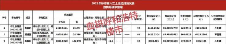 8月6日,呼市年度第6次土拍挂牌上线,这也是8月内第2次土地出让,本次合计挂牌3宗地块,无涉宅用地,土地性质均为商业用地(批发仓储用地),未来将用于企业进驻产业落地;