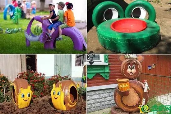 收集废旧轮胎,用巧妙的设计,将轮胎装饰成各种造型,涂上鲜艳的色彩,为孩子们献上了一份特殊的礼物,使轮胎变成儿童欢乐的游乐场。