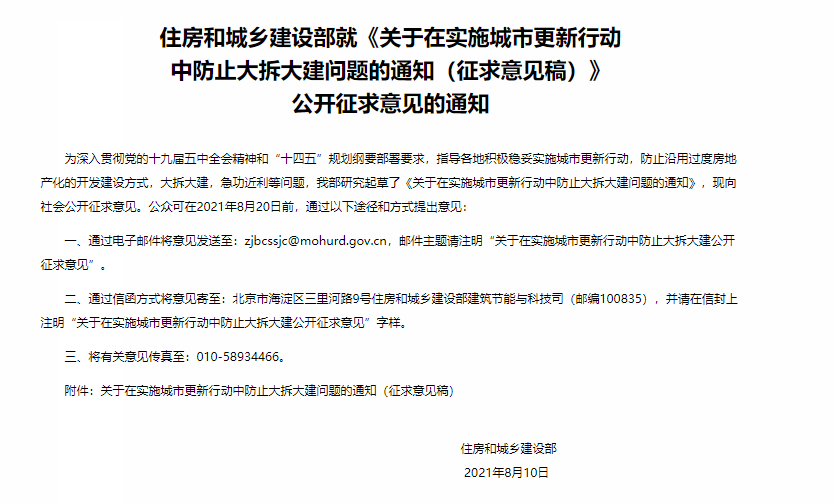 中国网地产讯 8月10日,住建部就《关于在实施城市更新行动中防止大拆大建问题的通知(征求意见稿)》公开征求意见。意见提出,除增建必要的公共服务设施外,不大规模新增建设规模,不突破老城区原有密度强度,不增加资源环境承载压力。严格控制老城区改扩建、新建建筑规模和建设强度,原则上更新单元(片区)或项目内拆建比不宜大于2。不大规模、强制性搬迁居民,改变社会人口结构,割断人、地和文化的关系。不大规模、短时间拆迁城中村等城市连片旧区,导致住房租赁市场供需失衡,加剧新市民、低收入困难群众租房困难。