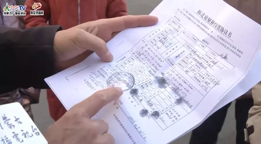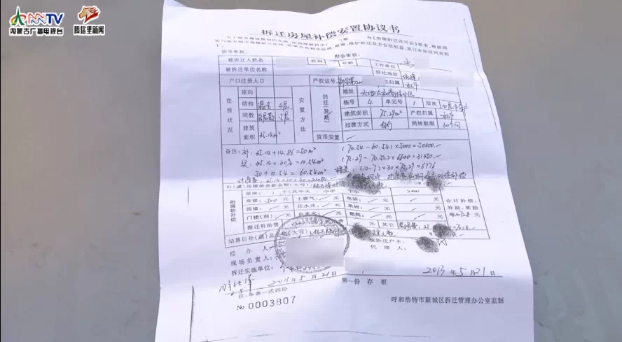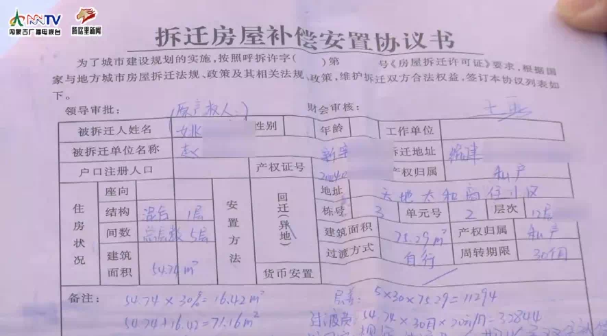 记者看到,在小区居民签订的拆迁房屋补偿安置协议书上写着,每户的平方米数,每平方米补偿的过渡费,以及30个月内补偿的过渡费总数。并且明确写着,按国家规定,过渡费逾期给予双倍补偿。 盖的章是呼和浩特市新城区东风路棚户区征地拆迁指挥部。