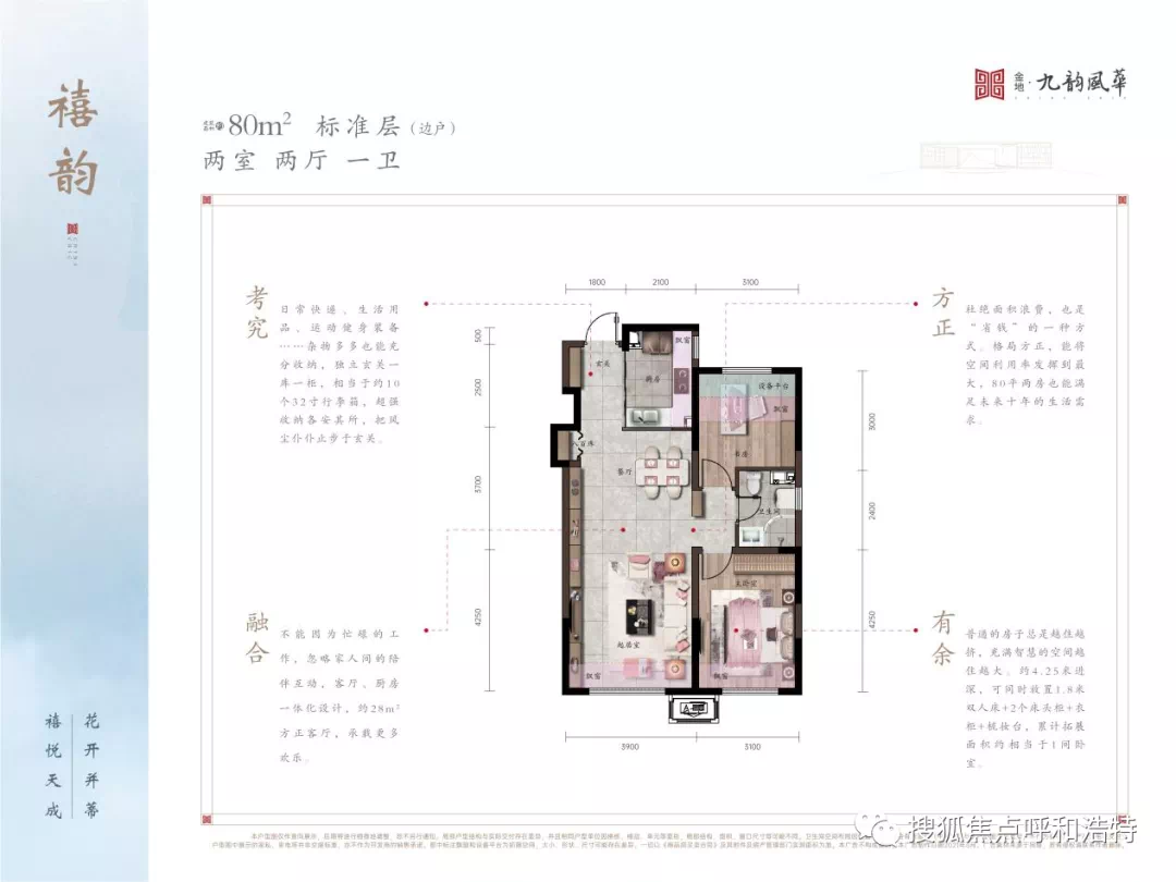 金地九韵风华位于庆凯街以南,化工厂西路以东,最小住宅户型为80㎡,是一个经典的小两居布局,户型方正,房间全明且公摊较小,开间能够达到3.9米,将80㎡的面积利用率达到较大。与其他小两居不同的是,它有一个“八百库”的设计,这个考究的小仓库,能够容纳更多生活所需,非常实用。