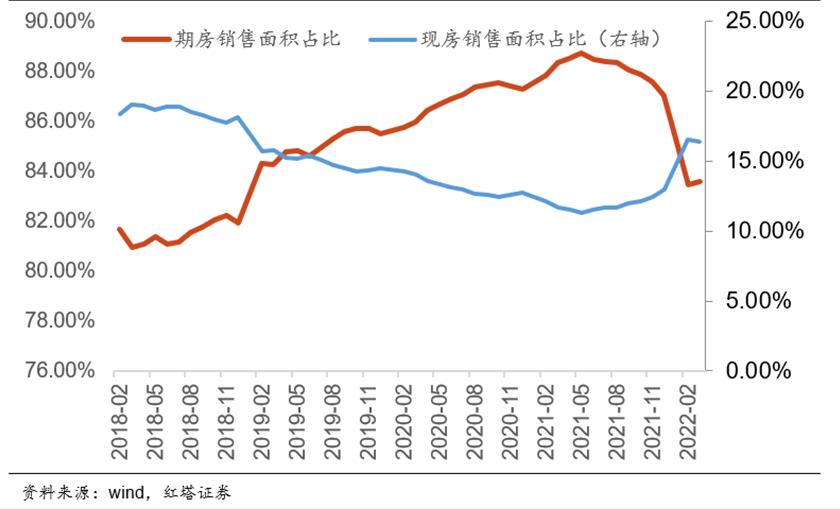 对房价上涨的强预期,以及对房企的信任使购房者具备购买期房的冲动。同时,房企也有加快地产周转速度,增厚收益需求,于是期房销售成为主流。当时,期房销售面积占总销售面积的比重持续攀升,一度超过85%,但目前这种销售模式已经越来越行不通。