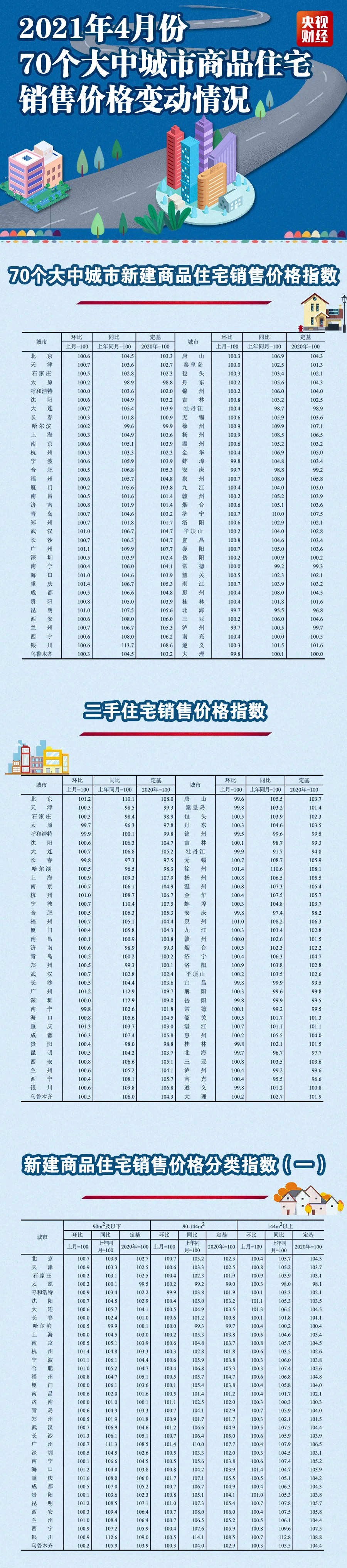 国家统计局公布2021年4月份70个大中城市商品住宅销售价格变动情况。