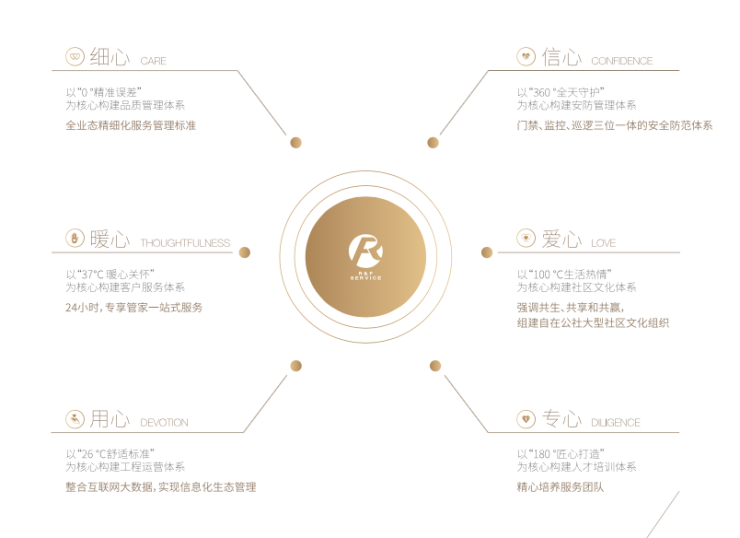 富力物业,以心护家,独创“六心服务体系”,以0°精准的“细心”、37℃ 的“暖心”、24小时的“用心”、100℃的“爱心”、180°的“专心”、360°的“信心”关怀每一位业主,为业主打造多元化、高质量新型全维服务。