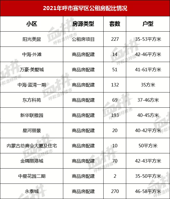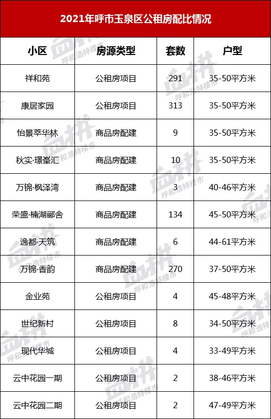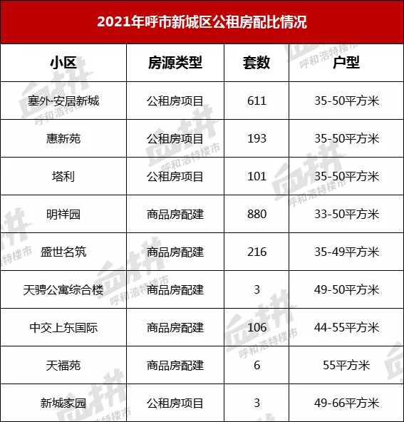 城区来看,新城区2119套占比最多,赛罕和玉泉区房源数相当,分别为1058套、1056套,回民区房源409套。房源类型分为两大类,新建公租房项目(惠新苑、塔利等),此类项目由相关部门牵头实施,建设完毕后,公开摇号配租;另一类是商品房配建项目,按照土地出让要求,呼市容积率2.0以上的住宅用地,配建公租房比例约为3%,包含中海、恒大、万锦、中交等新建项目均有公租房建设,这类住宅,居住环境较好,社区配套,物业服务体系完备,近年来,逐渐成为保障性住房的新选择。