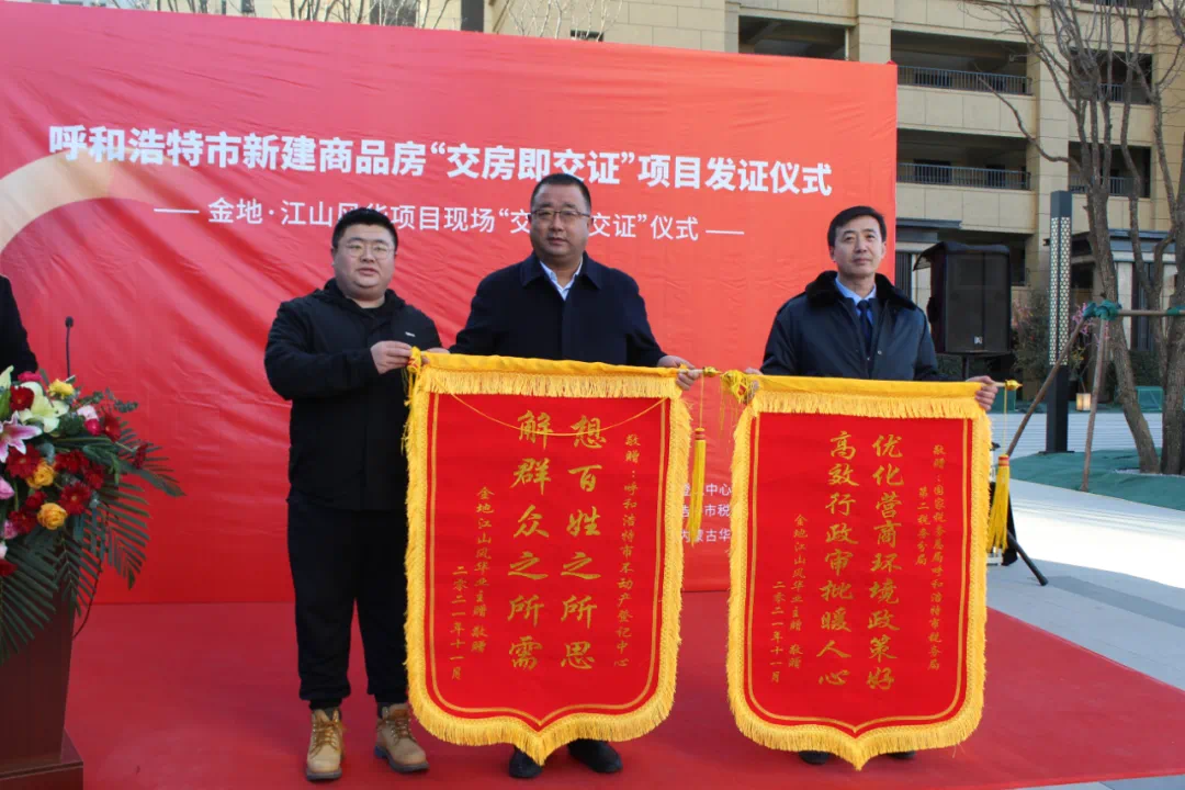 为践行“我为群众办实事”,市不动产登记中心从解决群众最关心和最急、最盼的问题入手,全面实施商品房“交房即交证”改革,11月30日上午,呼和浩特市不动产登记中心与国家税务总局呼和浩特市税务局第二税务分局共同参加金地江山风华项目“交房即交证”颁证仪式。现场30名业主在领取钥匙的同时,欣喜的领到了《不动产权证书》,成为呼和浩特市“交房即交证”的受益者,切实增强了业主办理《不动产权证书》的获得感。