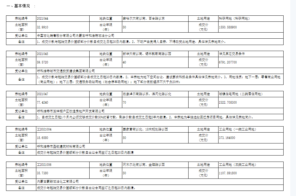 另外,位于巴彦淖尔南路以东、滨河北路以北的回迁房项目用地由呼和浩特市玉祥棚户区改造房地产开发有限公司竞得。位于察哈尔大街以南、百合路以东的科研用地由中国石化销售股份有限公司内蒙古呼和浩特石油分公司竞得。还有2宗为工业用地,其中,位于姜家营街以北、18米规划路以西的工业用地由呼和浩特市盈锐建筑材料有限公司竞得;位于阿木尔北街以南、金硅路以西的工业用地由内蒙古蒙联石油化工有限公司竞得。