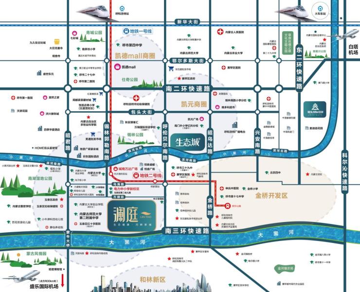 拥揽大黑河自然景观,蒙古风情园和南湖湿地公园两大公园围合,北侧还有规划中的约4.2万平体育公园,三园一河环伺,享有丰富的自然生态资源。600米即达呼和浩特市第四中学(原内蒙古电力中学)新校区,更有内师大附二中、内大南校区、呼市三十九中等优质教育资源。南万达商圈辐射,涵盖凯元广场、美通批发市场、凯德MALL购物中心等多重商业配套。紧临建设中的三环快速路、锡林南路,一千米内即有地铁2号线帅家营站,完善的交通路网让生活拥享更多便捷。