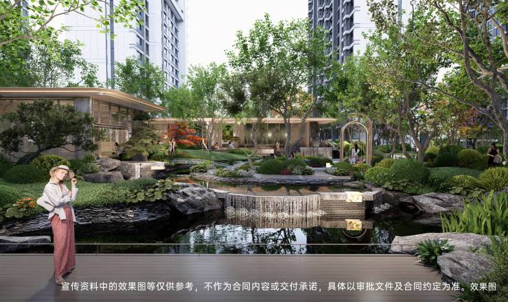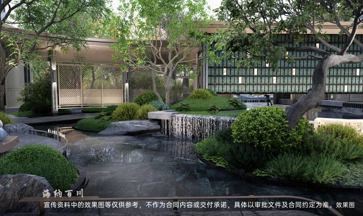 - **第二幕:海纳百川**:潺潺的跌水如同百川汇聚,弧形廊架仿佛收揽着星月。竹简照壁上镌刻着潮涌般的志向,林下的闲庭之中仿佛能听到百家争鸣。业主漫步其间,风掀书页的声音与流水声相互交织,构成包容万象的人文意境。