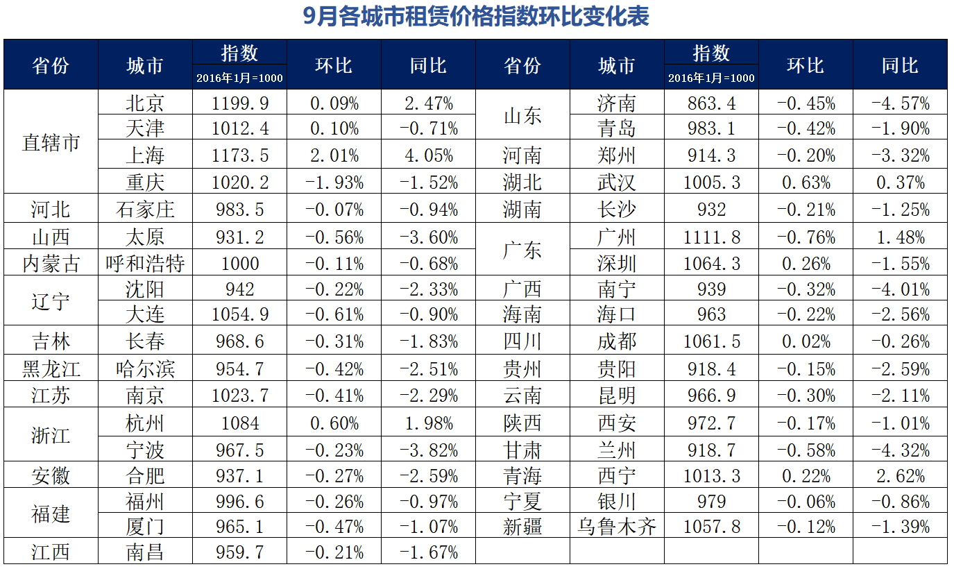 其监控的35个城市中,有8个城市(上海、武汉、杭州、深圳、西宁、天津、北京、成都)租赁价格指数环比上涨,上涨城市数量比8月减少1个。其中,上海、武汉和杭州位居涨幅榜前三,涨幅分别为2.01%、0.63%和0.60%。
