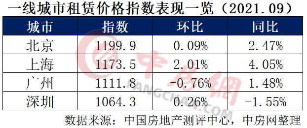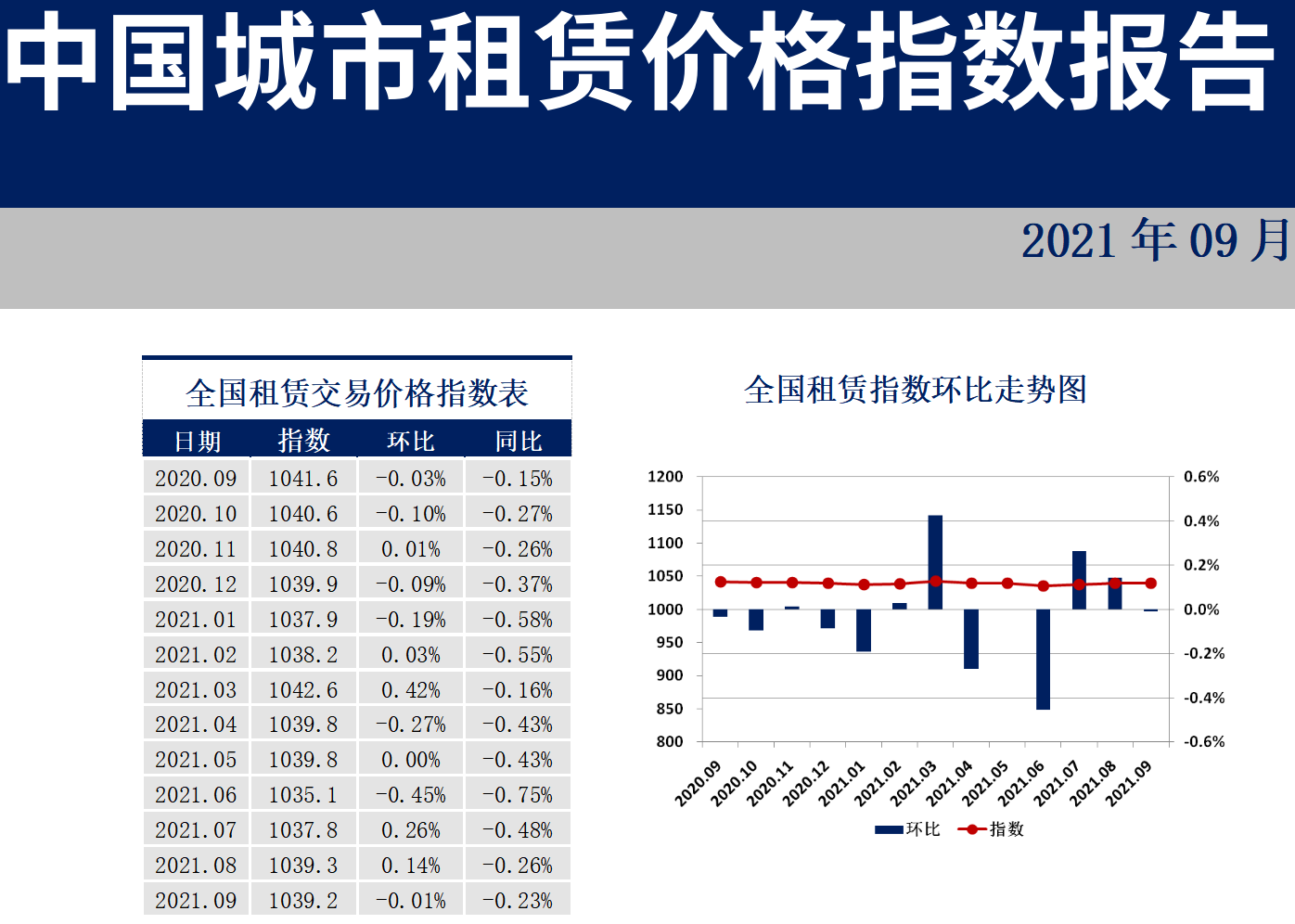 近日,由易居企业集团、上海易居房地产研究院中国房地产测评中心、华东师范大学东方房地产研究院三方共同发布的《中国城市住房租赁价格指数报告》显示,2021年9月,中国城市租赁价格指数为1039.2点,环比下跌0.01%,同比跌幅0.23%。