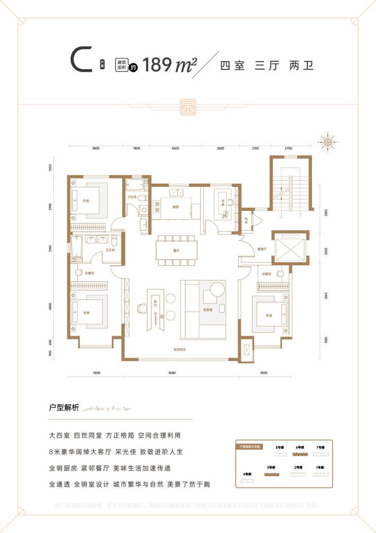 **C户型**:189㎡ 的四室两厅两卫户型,是珍藏的匠心之作。拥有8.5米奢阔宽厅,彰显主人的尊贵身份;大四居设计,大气恢弘,尽显品质生活。