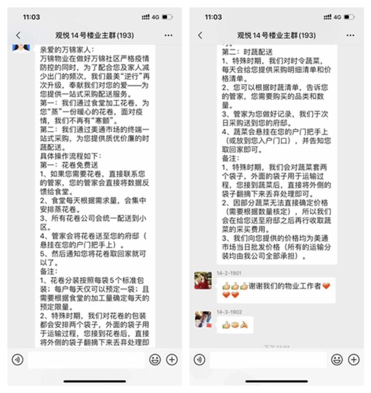 这次疫情中,下面这几家物业堪称呼市物业中的楷模:中海物业具备充足经验,在疫情爆发排名前列时间成立“防控应急专项小组”,五大防御体系遏制疫情扩散;中铁诺德物业在小区内、各单元进行消毒杀菌,不放过任何死角,还为业主采购新鲜蔬菜送进家门;秋实物业也启动物业管家“代购”服务,为业主代购肉类蔬菜生活物质,并免费送货上门;万锦物业甚至怕业主受困于家,没有充足食粮,蒸了满满几大笼花卷免费送到业主家里,亲切又暖心。这些优质物业,深受业主好评。