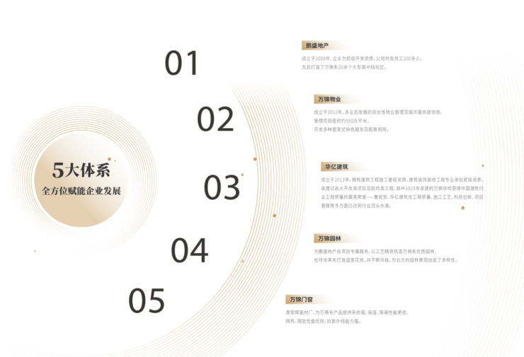 万锦自2008年成立以来,始终秉持“专注、品质、诚信”的开发理念,以高度的责任感兑现对业主的承诺,逐步构建起住宅开发、物业服务、工程建筑、园林设计、门窗建材五大体系。