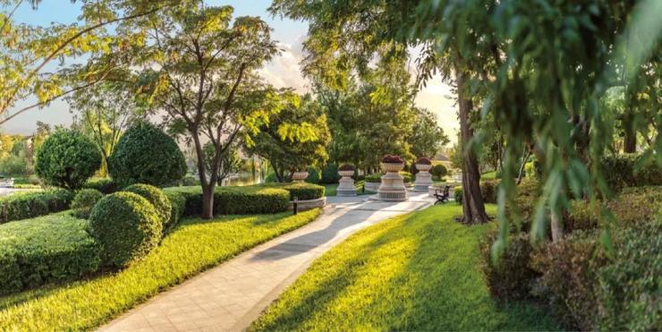 恒大金融小镇商务A区在规划时遵循景观优先原则,以高达35%的绿化率打造城市公共花园空间,通过自然景观的打造将商业与自然巧妙融合,园区内的道路使用茂密绿带相连,维持良好的生态环境,消费者在树荫下漫步让身心贴近自然,全身心地感受生态商业的魅力。