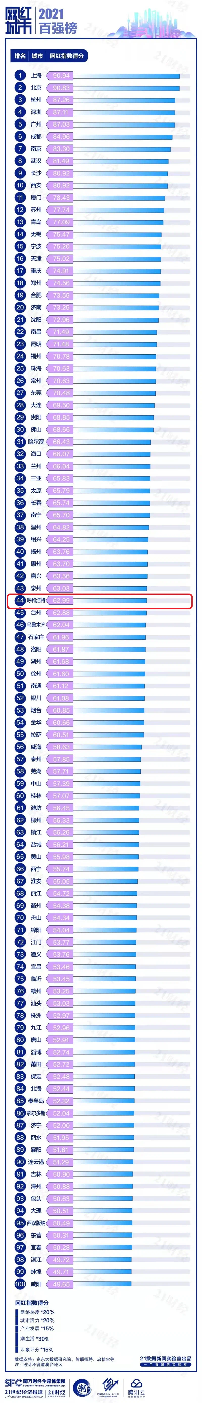 近日,第二届《中国潮经济·2021网红城市百强榜》发布,呼和浩特位列第44位。