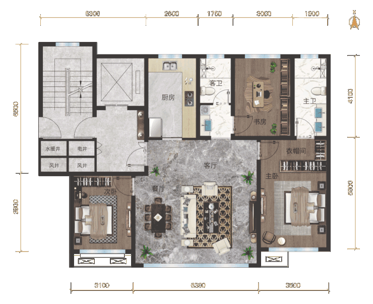 晴翠B区整个社区绿化率高达43%,容积率仅为1.79,规划为108—150㎡的小高层住宅,以伊泰华府晴翠B区125㎡的住宅举例,整个户型约有12㎡的面积不计入总空间,还有约6.3m的宽厅,大大增加了住宅的通透感和尺度感。高得房率+宽阔空间,这样的户型定会受到大众的喜爱。