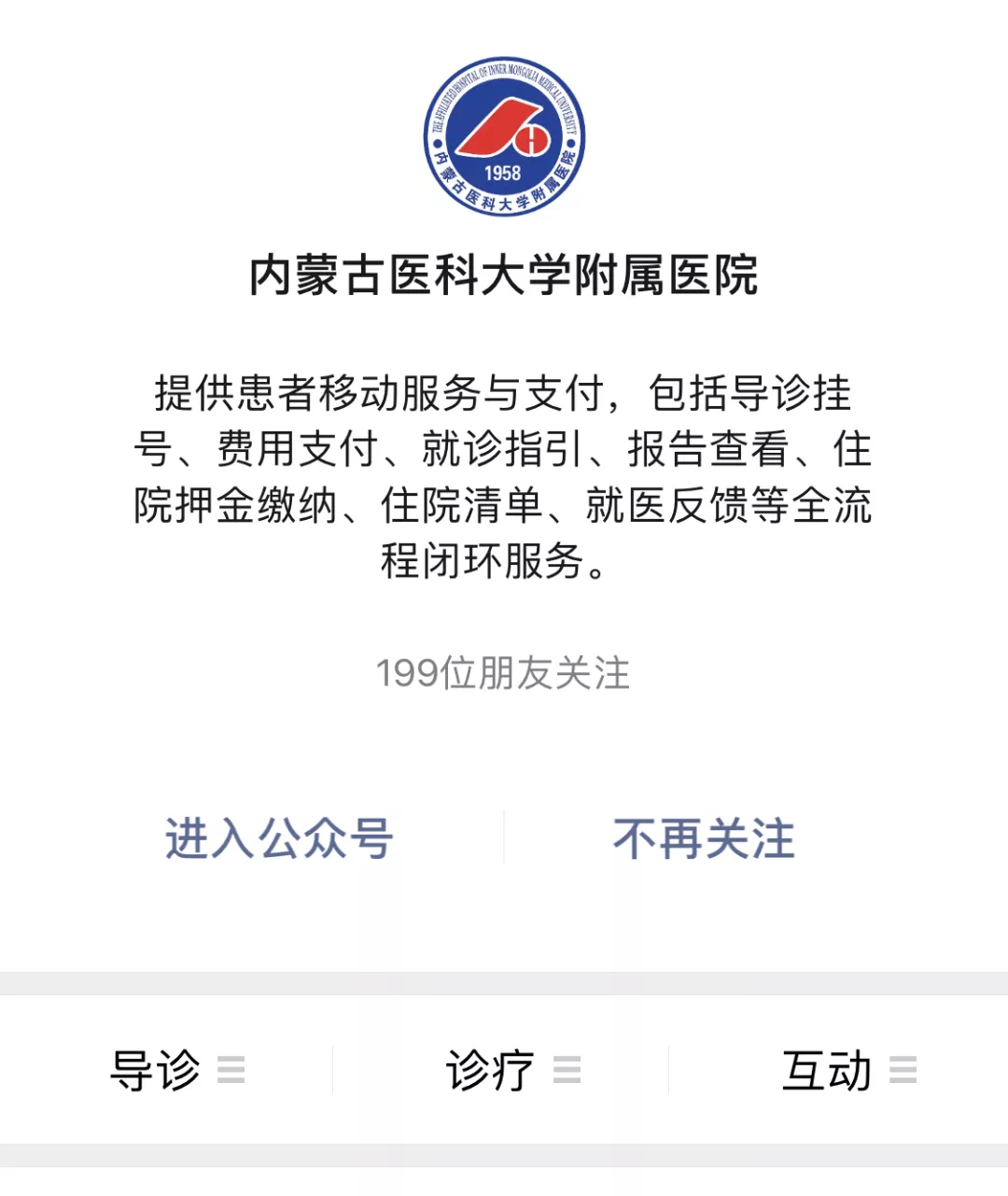 患者无需下载安装APP,直接通过微信公众号或支付宝服务窗关注“内蒙古医科大学附属医院”,就能访问“服务平台”,填写个人信息即可感受方便快捷的医疗模式。预约、挂号、候诊、引导、支付、报告等门诊就诊流程,都能在手机上完成。