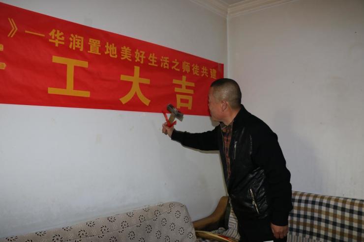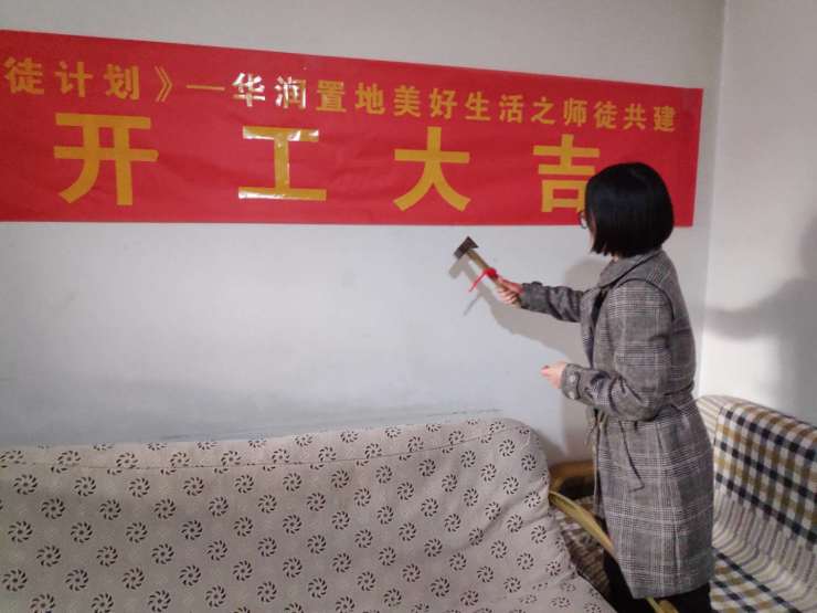 3月29号上午10:18分,吉时已到,华润置地策划王雅静女士、业主郭先生拿起系有红绸的锤子砸向墙壁,华润置地美好生活师徒共建公益活动工程正式开工!