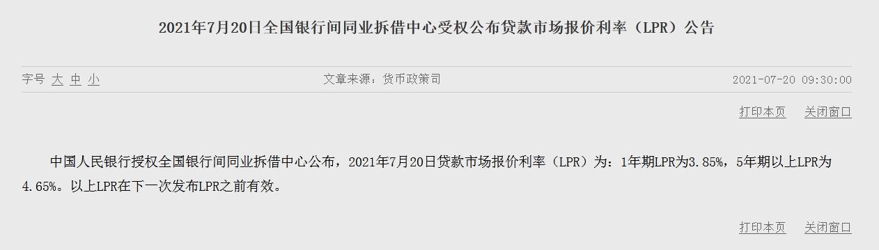 中新经纬客户端7月20日电 今天(20日),新一期贷款市场报价利率(LPR)出炉。中国人民银行授权全国银行间同业拆借中心公布,1年期LPR为3.85%,5年期以上LPR为4.65%。截至7月,LPR已“十五连平”。