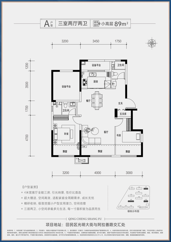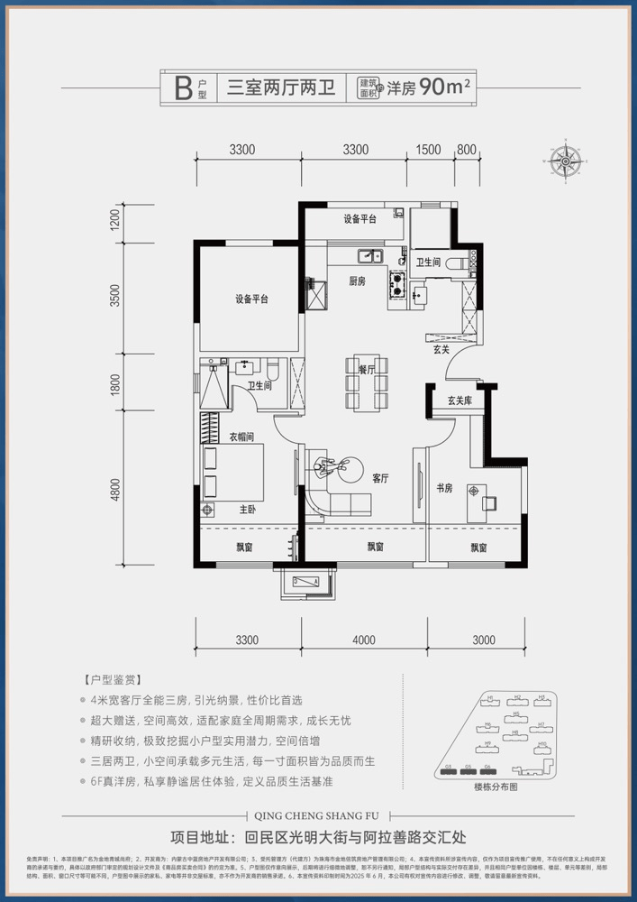 项目坐落于呼和浩特市回民区核心地段,光明大街与阿拉善北路交汇处西侧1公里(铁一中初中部北侧),总占地约27.95万平方米,总建筑面积达55.91万平方米。项目规划容积率2.0,绿地覆盖率超35%,住宅产权年限为70年。