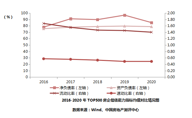 “三道红线”监管下,TOP500房企杠杆率有所降低,降杠杆初显成效。长期偿债能力方面,TOP500房企2020年资产负债率均值为78.77%,较上年下降0.89个百分点,为2012年以来首次下降;净负债率均值为85.08%,较上年下降11.62个百分点,相比2019年也有大幅改善。短期偿债能力方面,2020年TOP500房企短期偿债能力略有下降,流动比率均值为1.40,较上年下降0.05,速动比率均值为0.49,与上年持平。