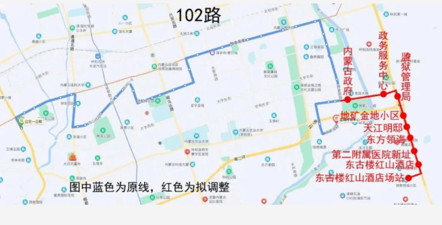 102路调整方案:延伸至东古楼红山酒店场站发车,由保全街左转至科尔沁快速路辅道,直行到敕勒川大街,后拐入腾飞南路恢复原线。
