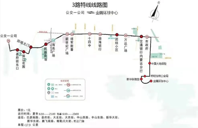 沿途设站:公交一公司、县府街东口、滨江花园、旧城北门、民族商场、海亮广场、新世纪广场、将军衙署、十四中、渤海银行、团结小区、万达广场、交通银行内蒙古分行、市政府、中国大地保险、呼和浩特公安局、新华联雅园、金隅环球中心