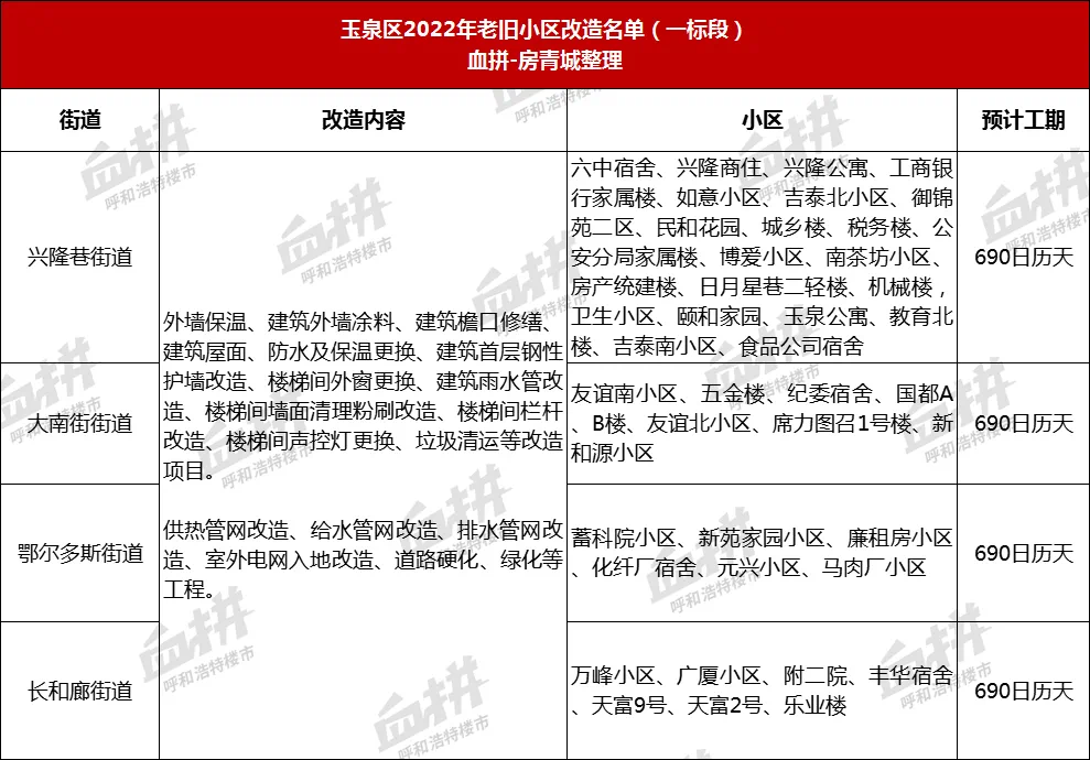 实施392个老旧小区、8个棚户区改造,试点打造5个“完整居住社区”;其中呼市四大城区301个小区(新城区91个,回民区51个,玉泉区84个,赛罕区75个),旗县91个小区(土左旗20个,托克托县26个,和林县10个,清水河县12个,武川县23个),共56326户,1429栋楼,建筑面积530万平方米。