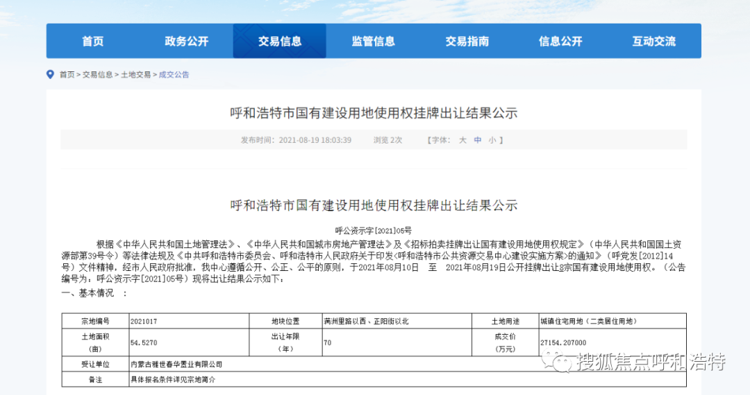 搜狐焦点“焦点地评线”报道:8月19日,呼市第五次土拍结果公布,本次共挂牌11宗地,6宗住宅用地,4宗科研用地,1宗教育用地,其中出让8宗地,流拍3宗地。