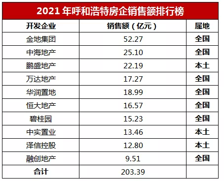 2021年呼和浩特楼市依然是房企百家争鸣的一年,根据销售信息统计,TOP10房企全年总成交额约203.39亿,金地集团以52.27亿销售额位列全市排名前列,销售额断层夺冠,中海地产以25.10亿位居第二,本土房企鹏盛地产位列第三。