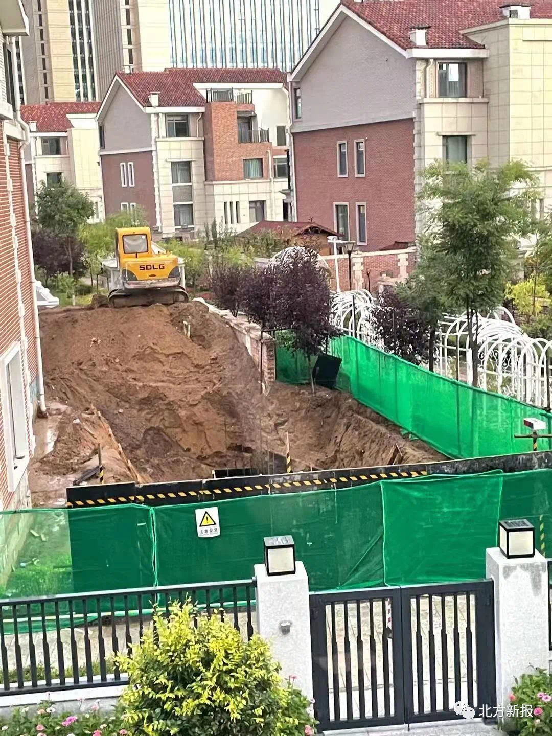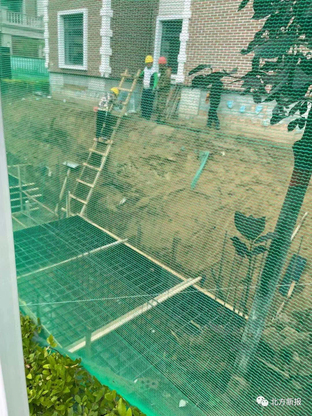 当日,记者在名都和景别墅区该栋别墅的施工现场看到,别墅为三层结构,在楼体东侧靠近小区内部道路的小院里,挖开了深约5米的大坑,坑内正在打地基,钢筋结构已经基本完成,尚未浇筑混凝土。五六名工人戴着安全帽,在坑内爬上爬下。据周边居民介绍,扩建大约从10天前开始,最多时有十几名工人同时施工。他们私下和该业主聊天时,对方表示要再建一栋楼房,根据地基的深度和规模判断,至少在两层以上。工人们还说,这栋别墅原本院子的占地面积没有现在这么大,此次施工扩建,也扩大了院子的面积,甚至还占用了部分小区公共用地。对此,居民们向物业公司和市长热线反映,但是未见明显效果。针对此事,日信海清物业公司名都和景项目部工作人员告诉记者,发现这种情况,物业曾经予以制止,但是毫无用处。8月24日和25日,接到群众反映后,城管执法人员已经到现场责令停工,目前尚未有处理结果。8月25日15时10分,周边居民向记者反馈消息称,目前仍有工人在现场施工,切割钢筋。