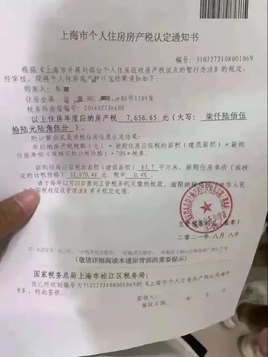 “上海开征房产税了?”最近你有没有听到过类似的声音?或者看过类似的文章?这一切,都源于前段时间的一张图,来自于一位上海市民的社交平台。这图的内容,是这位仁兄在8月份收到的《上海市个人住房房产税认定通知书》。通知书里写着,该仁兄持有住房面积为83.7平方米,新购住房单价或核定的计税价格为32670.48元,税率为0.4%,住房年度应纳房产税为7656.65元。