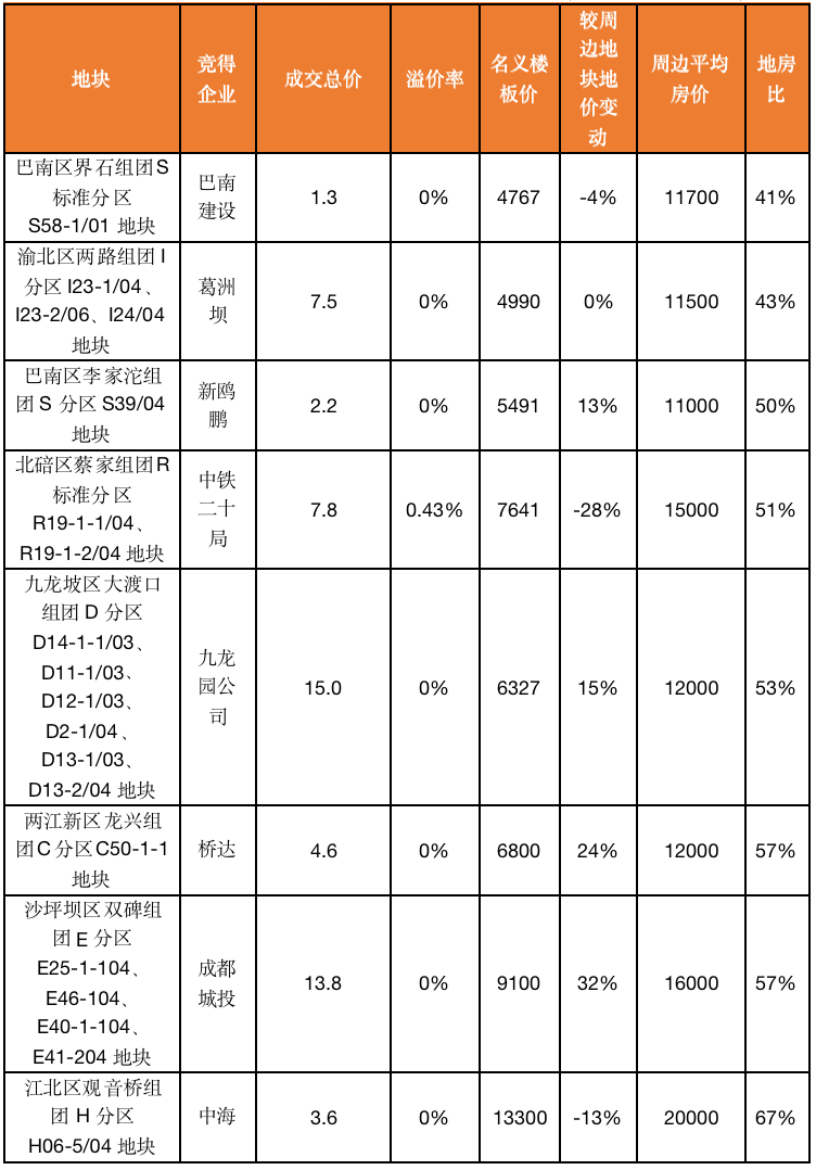 即使是本场土拍中少有溢价成交的北碚区蔡家地块(楼板价7641元/平方米),按照周边在售均价15000元/平方米来测算,地房比仅有51%,也能保持良好的盈利。