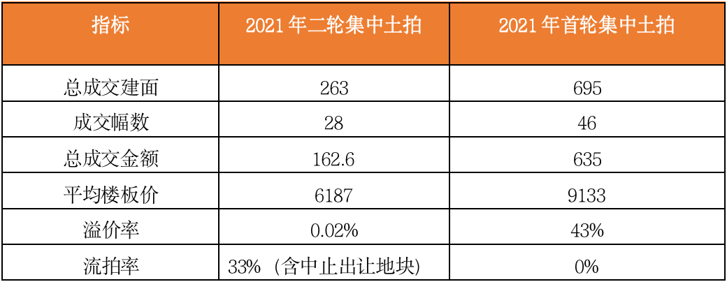 表:重庆2021年两次集中拍地土拍热度对比(万平方米、亿元、元/平方米)