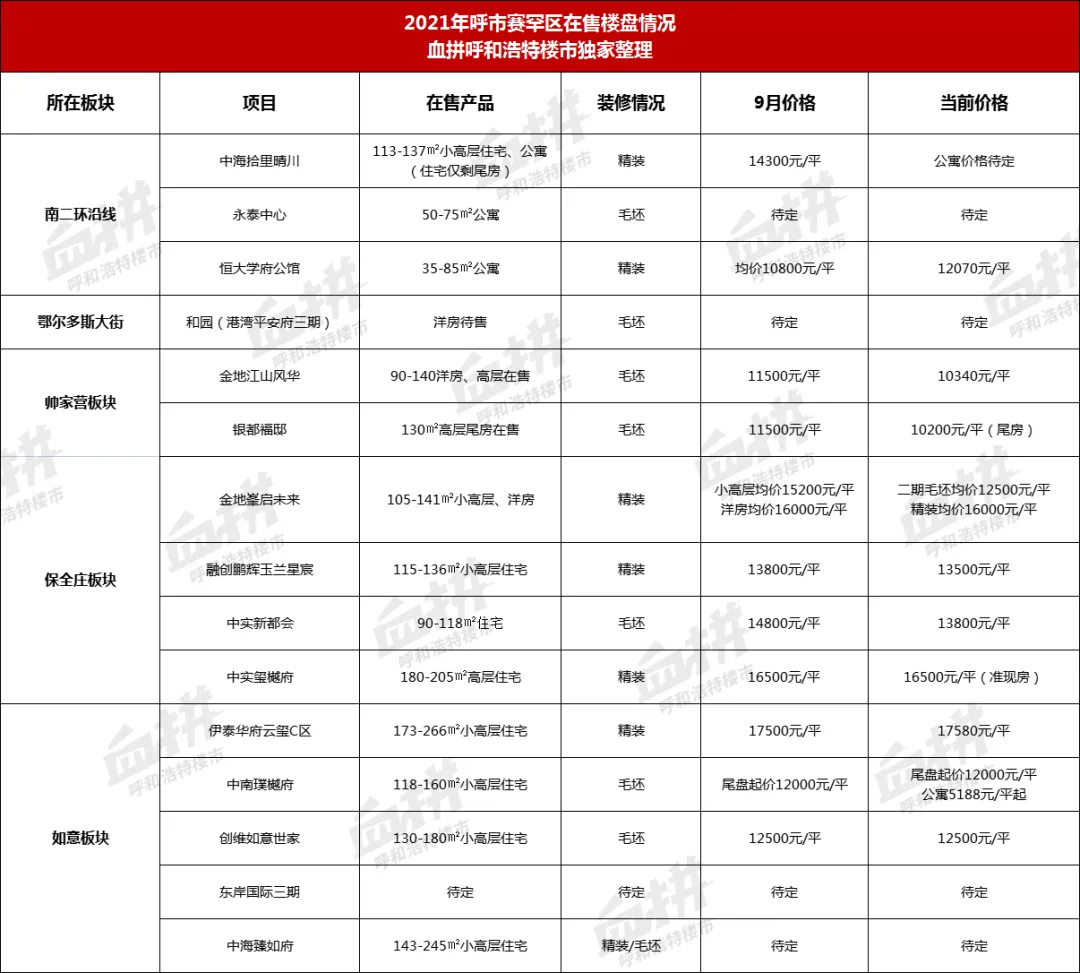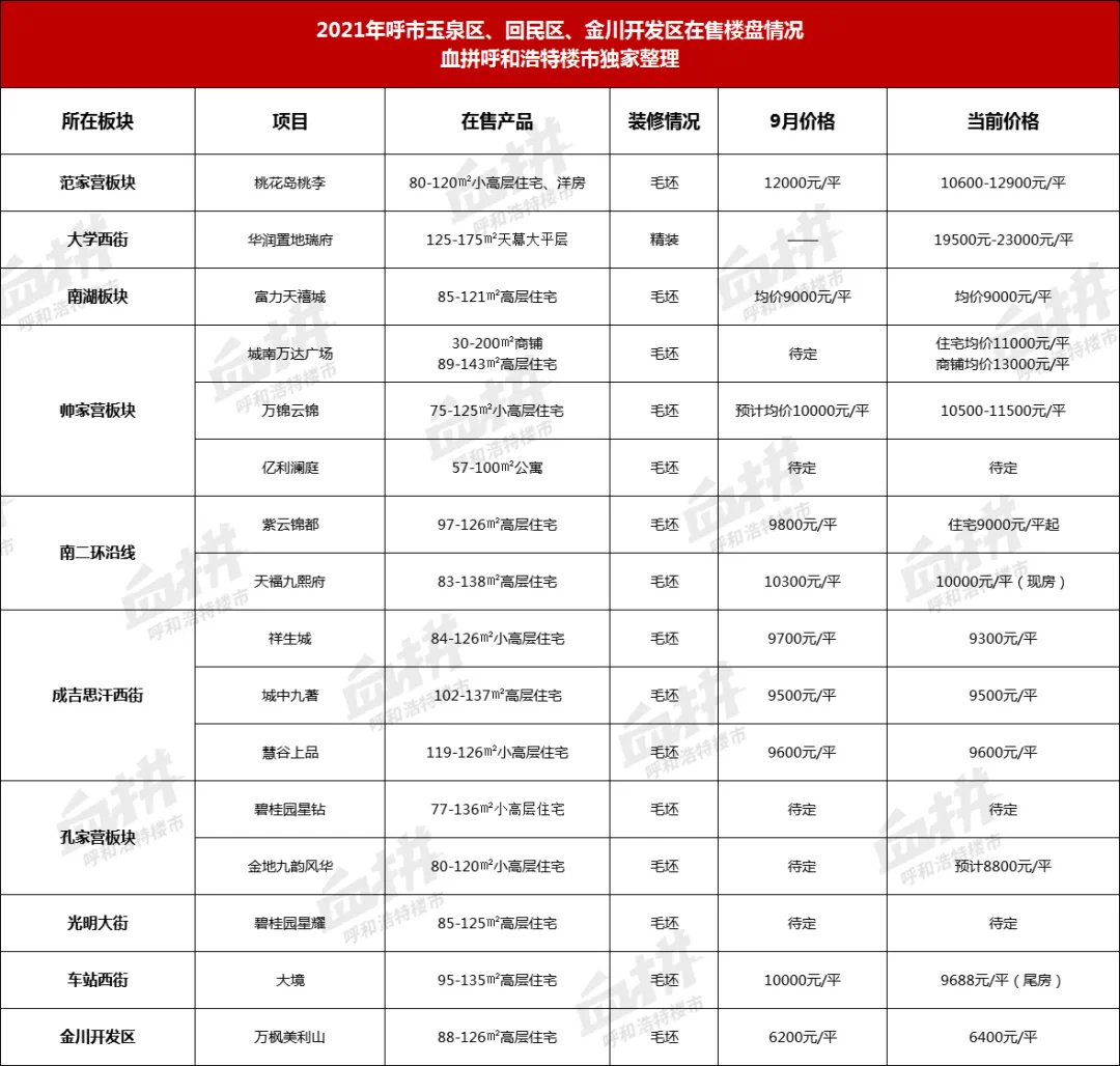 赛罕新城房价齐跌、城西重回9K档!10月呼市47个新盘报价