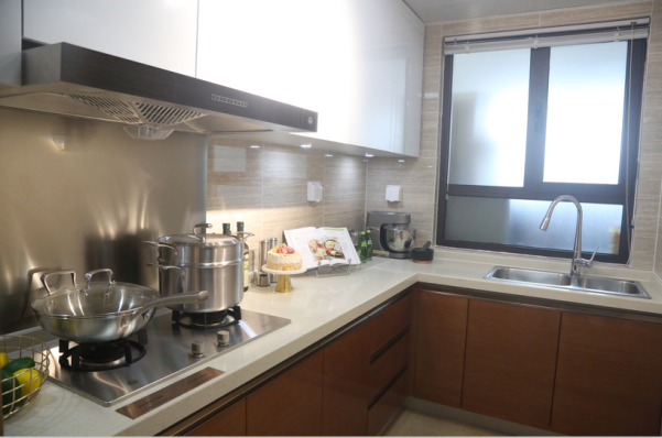 明亮厨房,甄选国际品牌厨具,经久耐用;抽拉式水龙头,全方位洗涤随心控制;内嵌式双水槽设计,充分利用空间;科学设计隔水沿操作台,视觉美观大方。