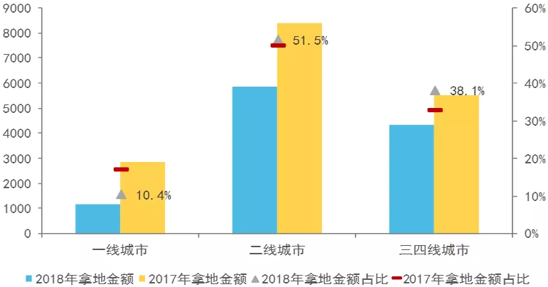 图:2018年房企各城市拿地金额分布情况