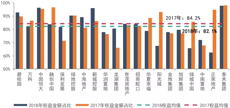 监管从严,行业资金面紧张,房企合作拿地力度加大。2018年,20家代表房企拿地权益比例均值为82.1%,较去年同期降低了2.1个百分点。其中阳光城、绿城中国、正荣地产合作意愿强烈,权益比例较去年下降近20个百分点,权益比例低于70%;融创、万科、华夏幸福等企业也纷纷加强合作拿地力度,权益比例较去年均有所下降。