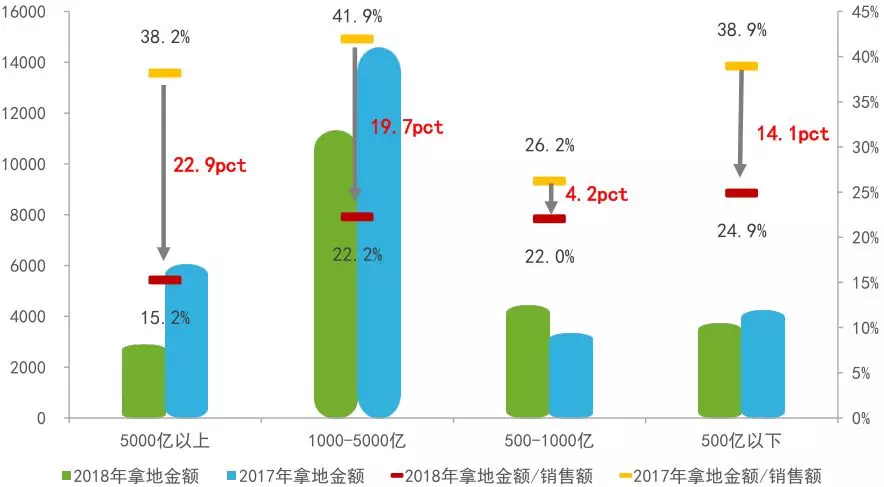 图:2017、2018年不同规模房企拿地情况