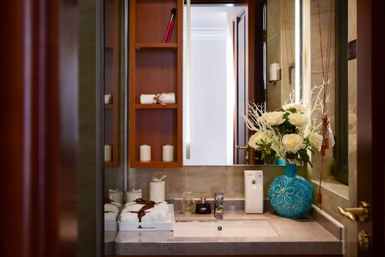 浴室内多功能隐形镜柜,柜内设置吹风机专用口,大空间、重功能,浴室到处都是瓶瓶罐罐的杂乱,瞬间无影无踪。
