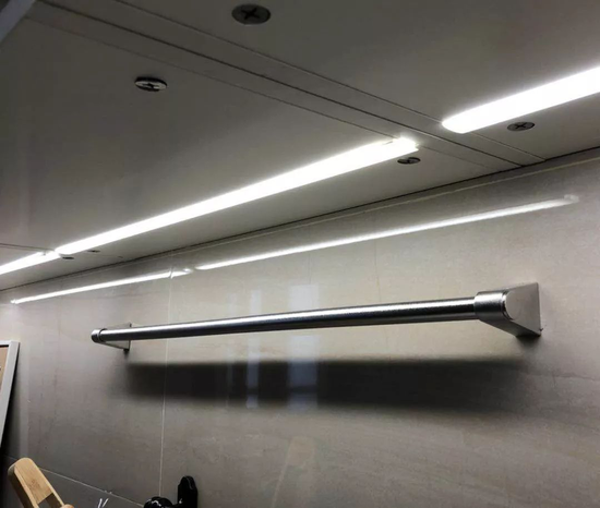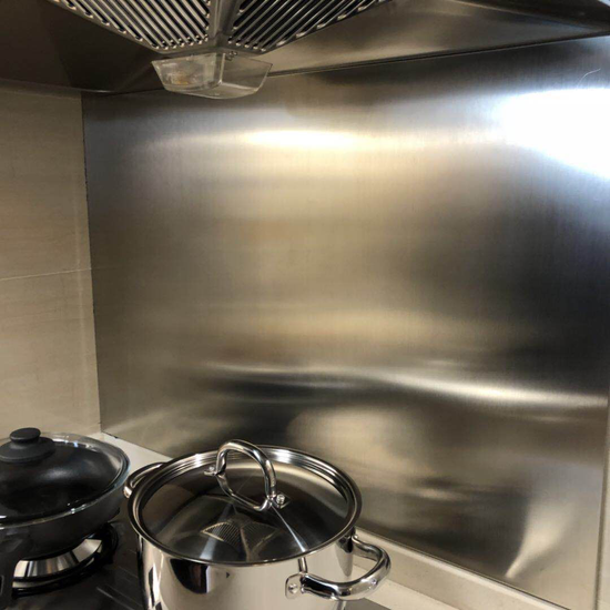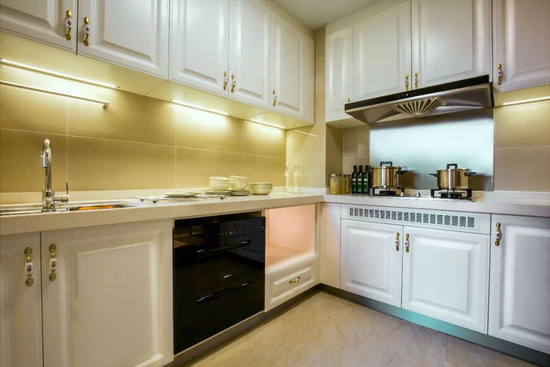 烟机处砖面增设不锈钢防油烟背板,易擦洗,好打理,轻松解决油烟固着的问题,柜底内侧暗设暗灯装置,加班回家安心煮面,不怕惊扰家人。